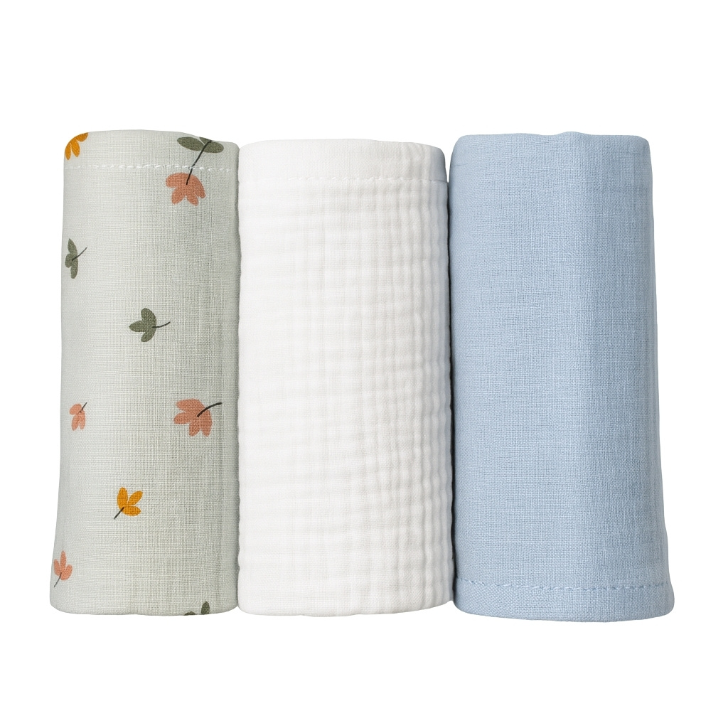 Pieluszki muślinowe, ulewajki, chusteczki, 30x30cm, 3 szt.- zielony listek, biały, niebieski